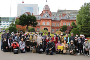 栄東連合町内会では、交通安全運動に重点的に取り組んでおり、季節ごとに各地区で行われる交通安全市民総ぐるみ運動時の該当啓発のほかに、連町独自で毎年秋に「交通安全玉ねぎキャンペーン」を実施しています。 また、さっぽろ雪まつりの開催期間には、「雪まつりウェルカム事業」として、つどーむ会場では栄東地区の住民による雪像の制作、地下鉄栄町駅では観光客への道案内等を行うなど、地域を挙げて来場者のおもてなしを行っています。連合町内会女性部の活動も盛んであり、令和元年度で29年目を迎える「健康ウォーク歩こう運動」をはじめ、35回目となる「早春女性のつどい」は地域住民の交流と親睦の促進に寄与しています。 地区を4つに分けてそれぞれに分区長を配し、連合町内会と単位町内会との連絡・調整を行い、毎年、分区ごとに防災訓練を実施するなど、高い防災意識を持っています。(写真は、栄東地区にあった日の丸農場の記念碑と菊地裕嗣・栄東連合町内会長)