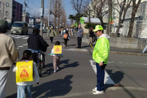 栄町交差点で交通安全を願い、50名が街頭啓発