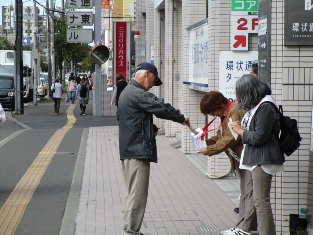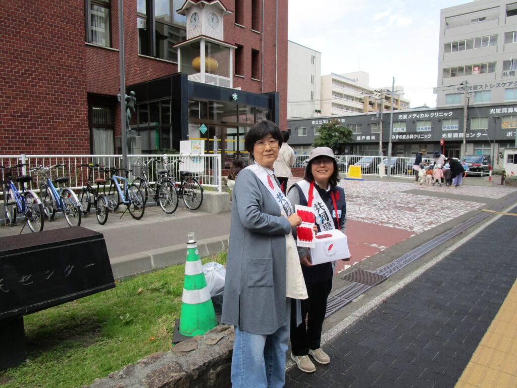 令和7年10月1日(水)、今年度の「赤い羽根共同募金運動」のスタートに合わせて、鉄東地区女性部連絡協議会(地下鉄東豊線環状通東駅前)、鉄東地区民生委員児童委員協議会(東区役所前)が街頭募金を実施しました。