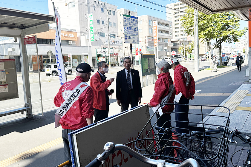この日は、10月にしては気温が上がっていましたが、参加したみなさんは、道行人々に「赤い羽根共同募金にご協力をお願いします」と一生懸命呼びかけていました。途中、東区共同募金会の岩谷会長が激励に訪れ、呼びかけにも一層力が入っていました。
