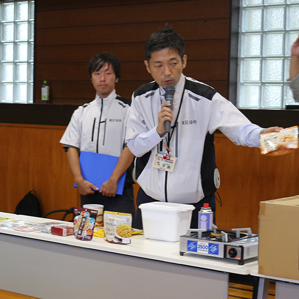 途中、非常食を加熱剤で温めた温かい食事の試食も行い、東区職員からは、備蓄物資についての説明を受け、実際の重さの体験などを行いました。
