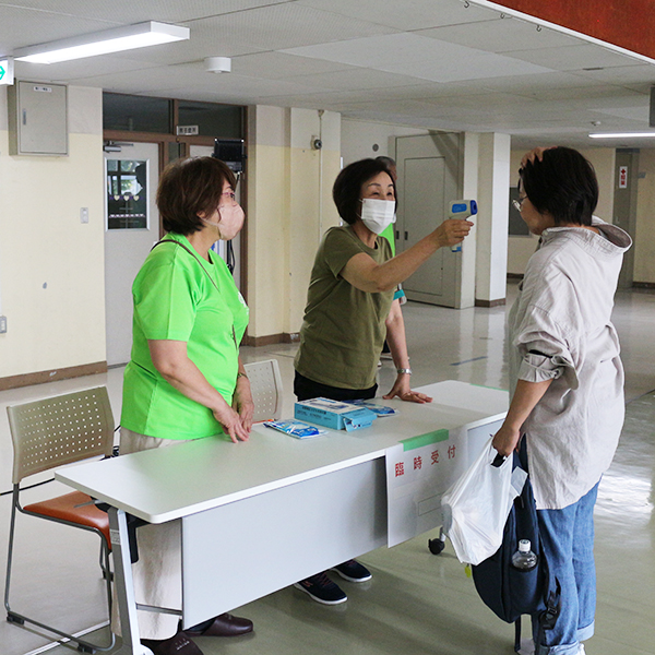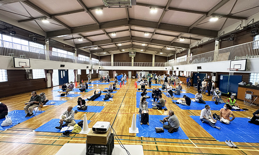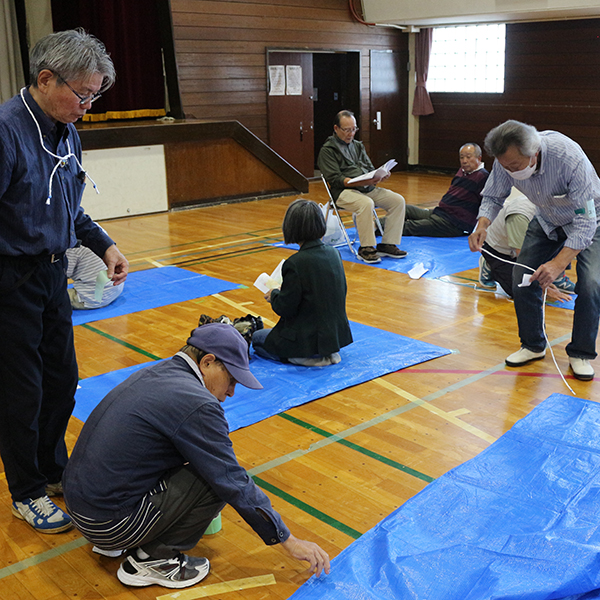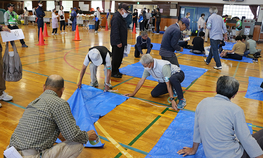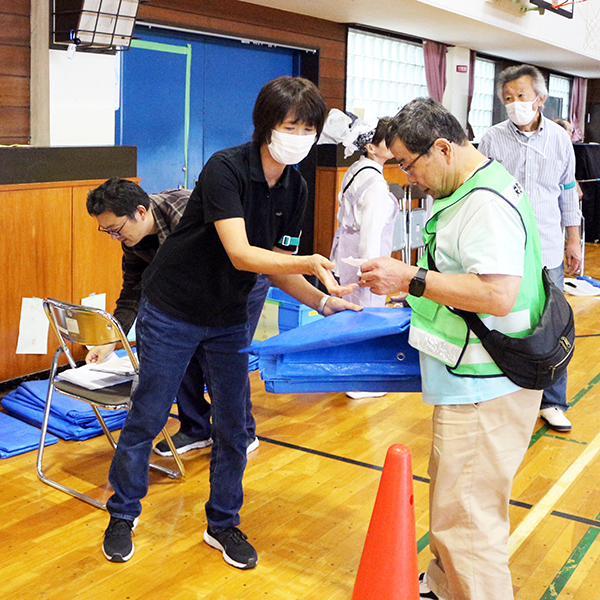 最初、駆け付けた札幌市職員が暗証番号を入力して、学校を開錠するというところから訓練をスタートし、4階の備蓄庫から非常食や防災用品を体育館に運び、東側玄関に受付を設け、体調不良者を検温して受け付ける臨時受付も設けました。体育館では、避難者を疑似家族に設定し、1人用、2人用から5人用まで避難スペースをつくり、みなさんに割り当てるなどの実践さながらの訓練です。