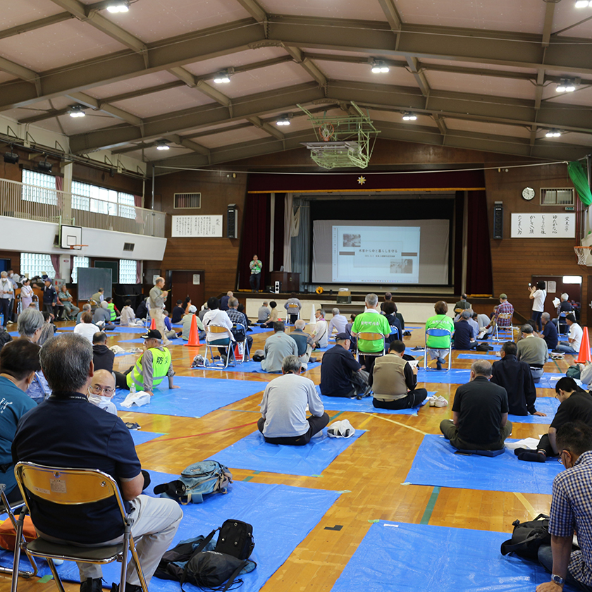 また、避難スペースに落ち着いてからは、避難者に映像を使って栄東地区を取り巻く水害リスクや避難時の対応、情報収集などのミニ講座で、いざというときの対応を学びました。