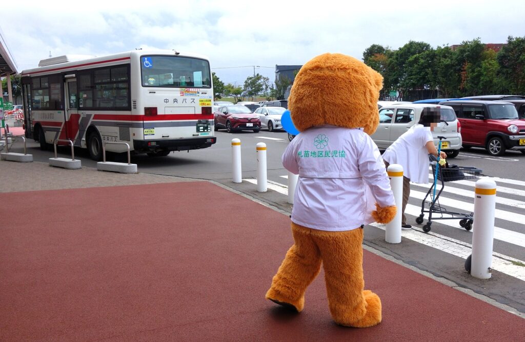 札苗地区民生委員児童委員協議会には強力な助っ人(くまの着ぐるみ)が応援に来て、付近を通る子どもたちは大喜びしていました。