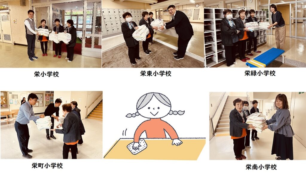 10月8日、栄東連合町内会女性部が、栄東地区の5つの小学校(栄、栄東、栄緑、栄南、栄町の各小学校)などを訪ね、単位町内会の女性部などが縫った雑巾を寄贈しました。