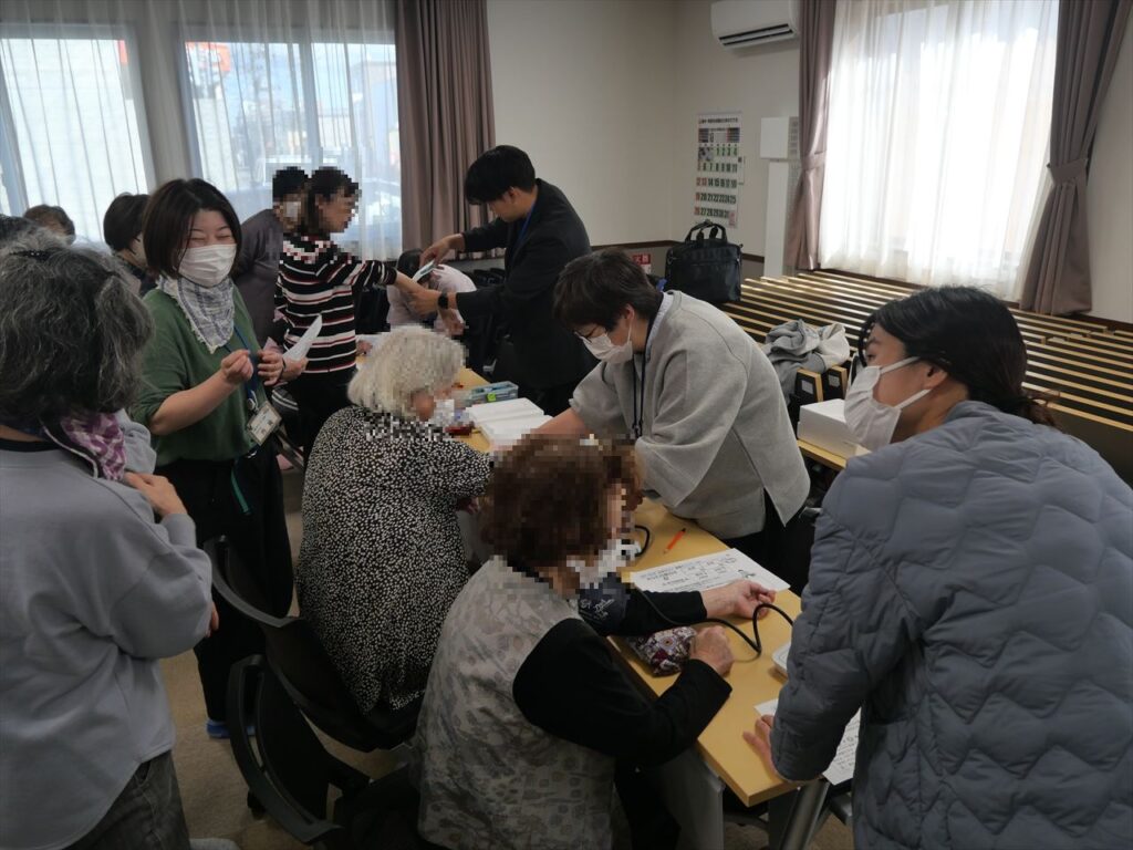 前回に引き続き東区健康・子ども課、東区社会福祉協議会、介護予防センター北栄の協力により会場に設けた健康コーナーでは、肌年齢、血圧、握力の測定器を設け、来場者が自身の数値の変化に興味津々でした。