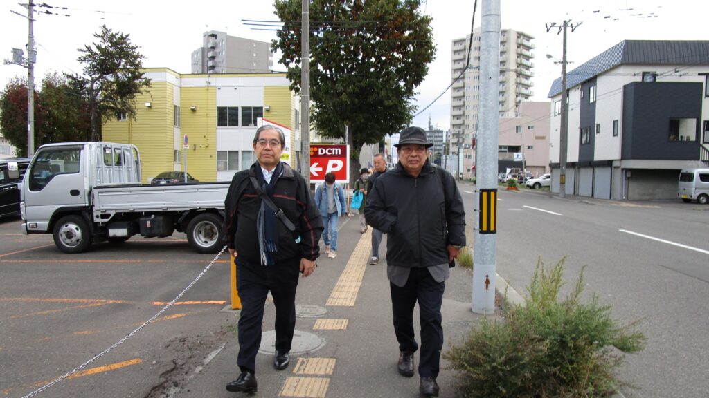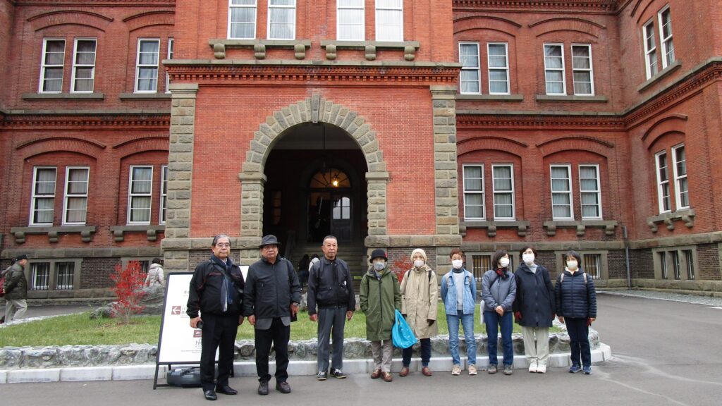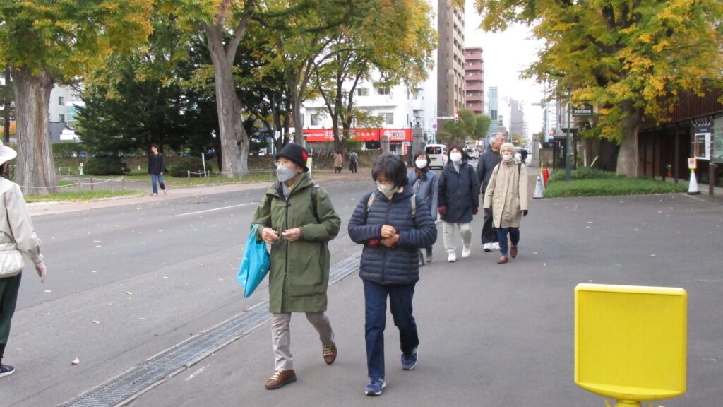 午前10時に、鉄東会館を出発し約2㎞、1時間弱で到着です。道庁赤レンガは札幌市を訪れた観光客や紅葉を楽しむ市民がたくさんおり、記念写真を撮ったりスケッチをするなど、それぞれに楽しんでいる様子でした。
