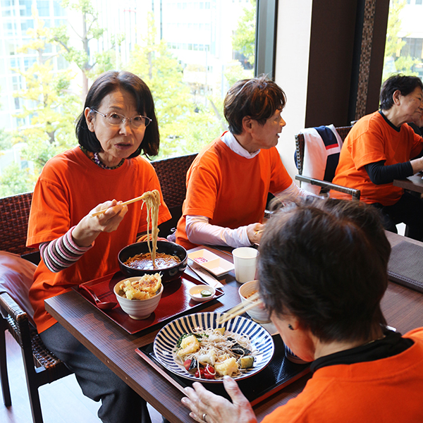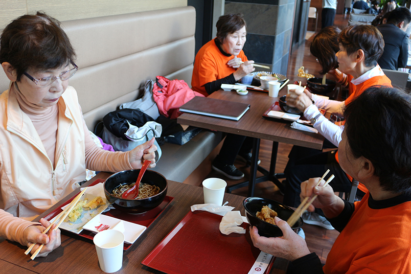 また、庁舎内には白い恋人の直営店もあり、買い物をしたりして楽しんでいました。場所が都心部のため、グループで近くのレストランで昼食を取りながら世間話に花が咲いていました。知らず知らずに1万歩を超えたばかりではなく、こうした交流も、健康ウォーク歩こう運動の楽しみと言えましょう。