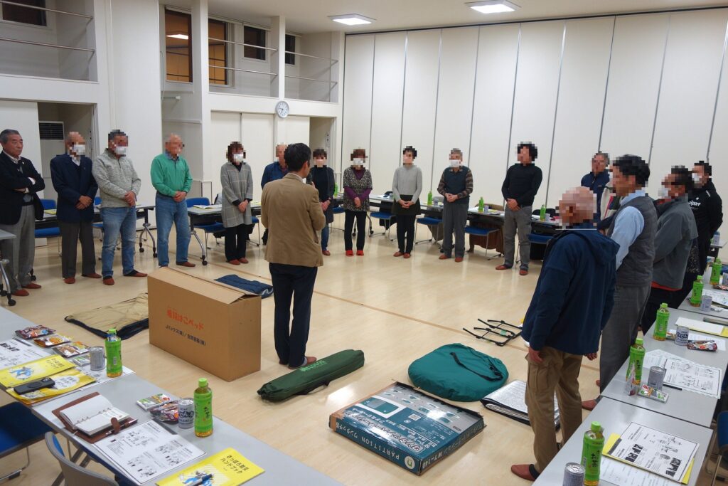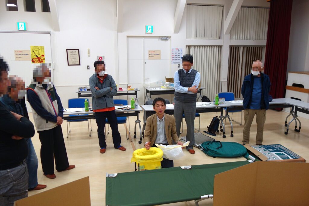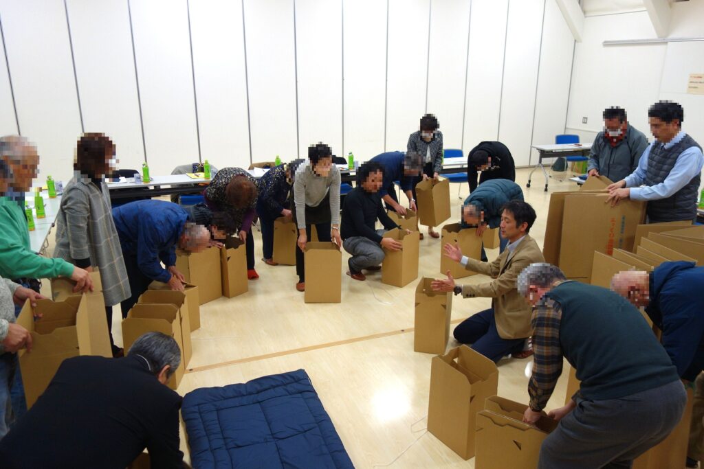 後半は避難所の備蓄品確認や段ボールベッドの組み立て体験などを行いました。