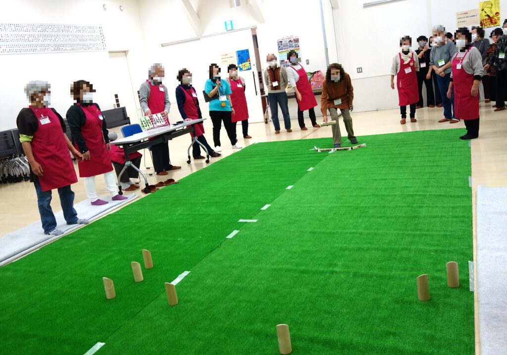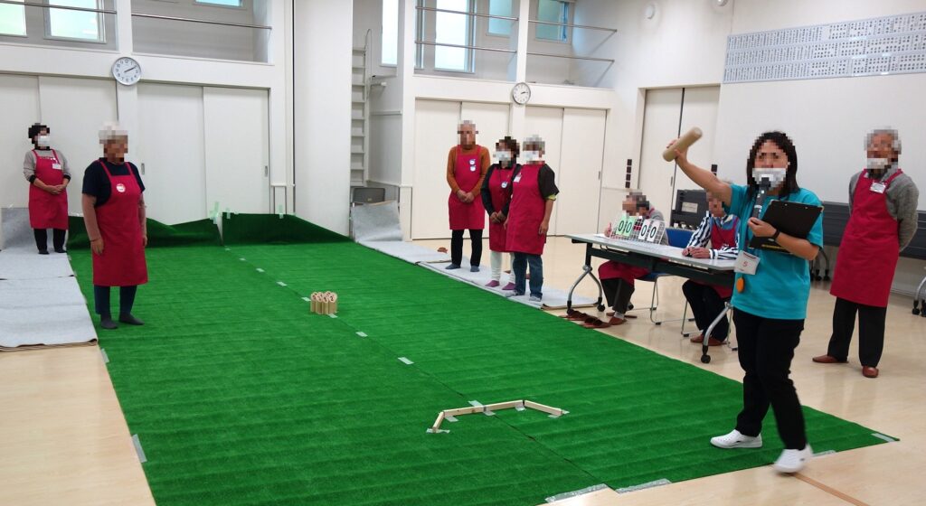 約20名の地域住民が集まりテーブルでゲームなどをおこなった後、「モルック」で楽しみました。