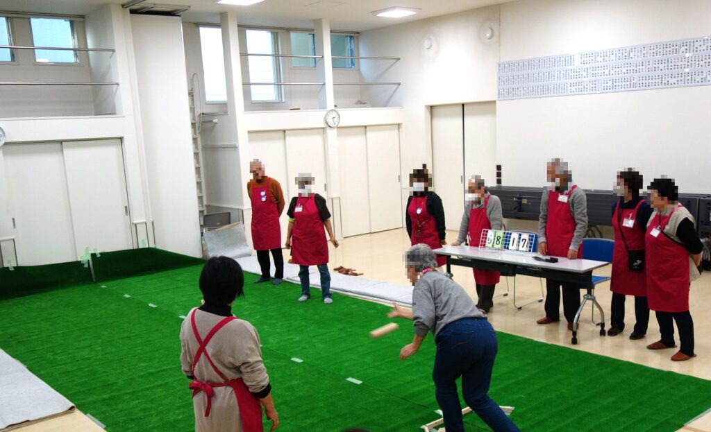 約20名の地域住民が集まりテーブルでゲームなどをおこなった後、「モルック」で楽しみました。
