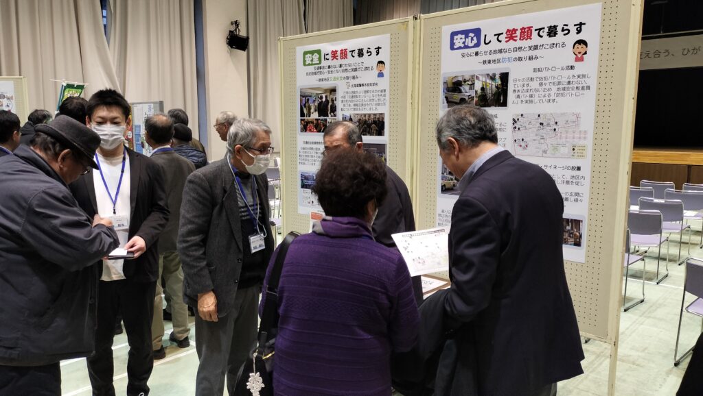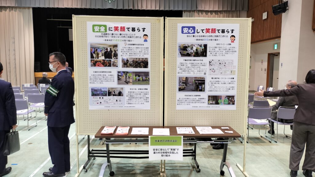 第1部で、鉄東地区連絡協議会は「安全に安心して”笑顔”で暮らせる地域を目指した取り組み」をプレゼンしました。 鉄東地区連絡協議会の設立から現状、防犯・交通安全における取組み内容を「意識づくり」・「地域づくり」・「環境づくり」の三つの柱に分けて説明。