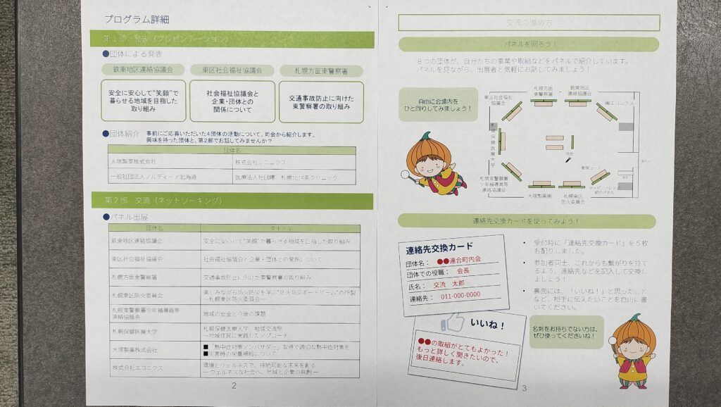 交流会は、東区各地域をはじめ、タッピーフレンズ企業など参加者同士のつながりから東区を活性化するために開催されており、今年で3回目となります。 第1部は、団体による発表で、鉄東地区連絡協議のほか、東区社会福祉協議会、札幌方面東警察署がプレゼンテーションを行い、第2部の交流では、8つの団体のパネル出展スペースで、出展者と気軽に情報交流が行われました。