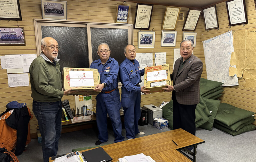 栄東地区と栄西地区では、札幌市東消防団栄分団(山口隆志・分団長、団員31名)が活躍されています。歳末は、特に火災に注意しなければならない時期で、同分団では歳末の特別警戒を実施しています。このため、栄東連合町内会防火防犯部(中谷昭暁・部長)では、菊地・同連合町内会長と一緒に、12月22日、同分団の詰所(通称:番屋。東区北46条東2丁目)を訪ね、栄分団の日ごろの活動と歳末の特別警戒に感謝を込めて、慰問・激励しました。
