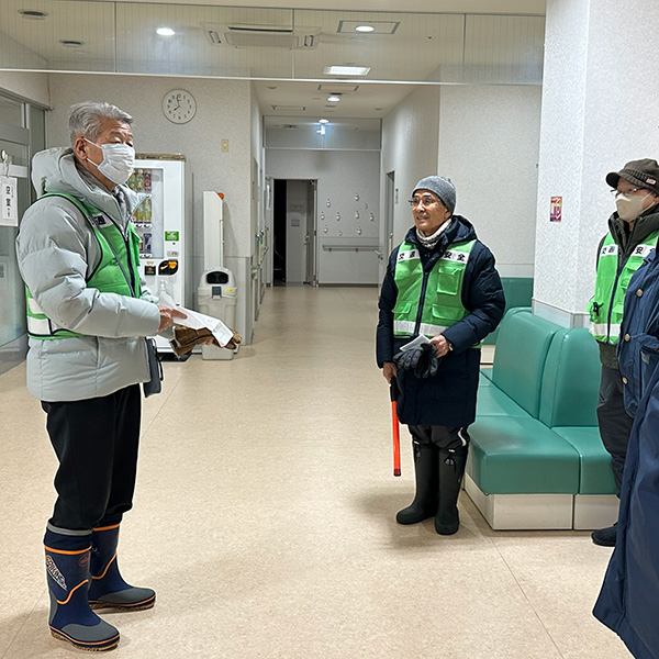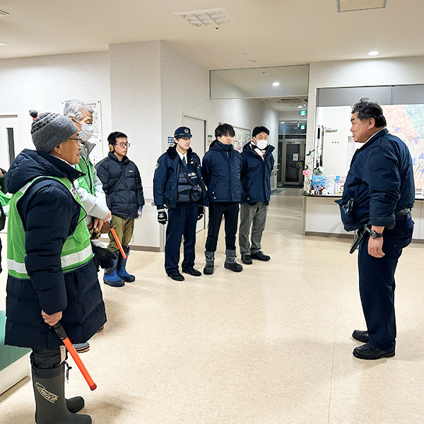 道路は滑りやすくなっており、慎重に足元を確かめなら、五十嵐会長がお話しする「この通りでは、過去こんなことがあった」などの留意事項を確かめながら、白い息を吐き、左右に気を配りながらパトロールしました。