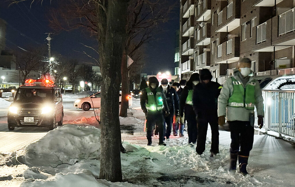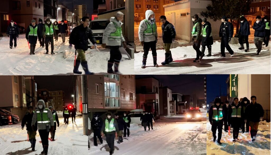 午後8時に栄町ケアセンター(東区北47条東17丁目)に集合し、同町内会で駐車違反が多い通り、中学生などがたむろしがちな公園、また、過去トラブルが発生した地域などを中心に、同町内会エリアをパトロールしました。
