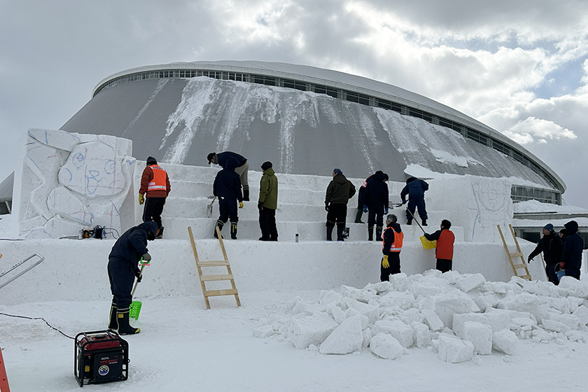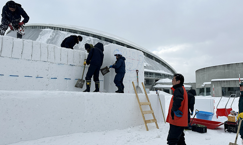 いよいよさっぽろ雪まつりが来週開幕します。つどーむ会場でも雪像づくりが進んでいますが、1月30日、栄東地区のウエルカム雪像づくりが開始されました。初日は、まず、小学生が制作する雪だるま100基余りが設置されるひな壇づくりです。
