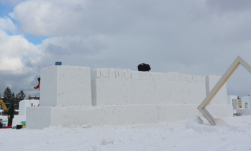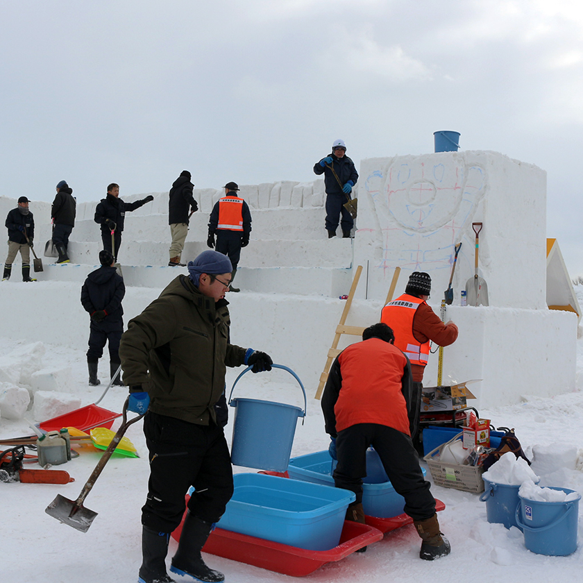 ひな壇は、横幅約14mの中央に位置し、9mを超える雪の塊から削り出す大変な作業です。今年も東区緑化協力会の15名の方々が、しっかり水準をとってエンジンチェンソーをつかって削り出します。造園業で培ったスキルを活かし、あっという間に作業が進みます。切り取った雪塊を上段にのせ、隙間を雪のシャーベットで埋め、4段のひな壇の完成です。ひな壇づくりは、過去、栄東地区のメンバーが1日半もかかっていましたが、東区緑化協力会の支援で3時間余りで出来上がりました。同会にご支援にこの場を借りてお礼申し上げます。