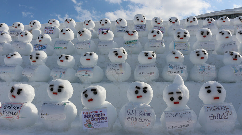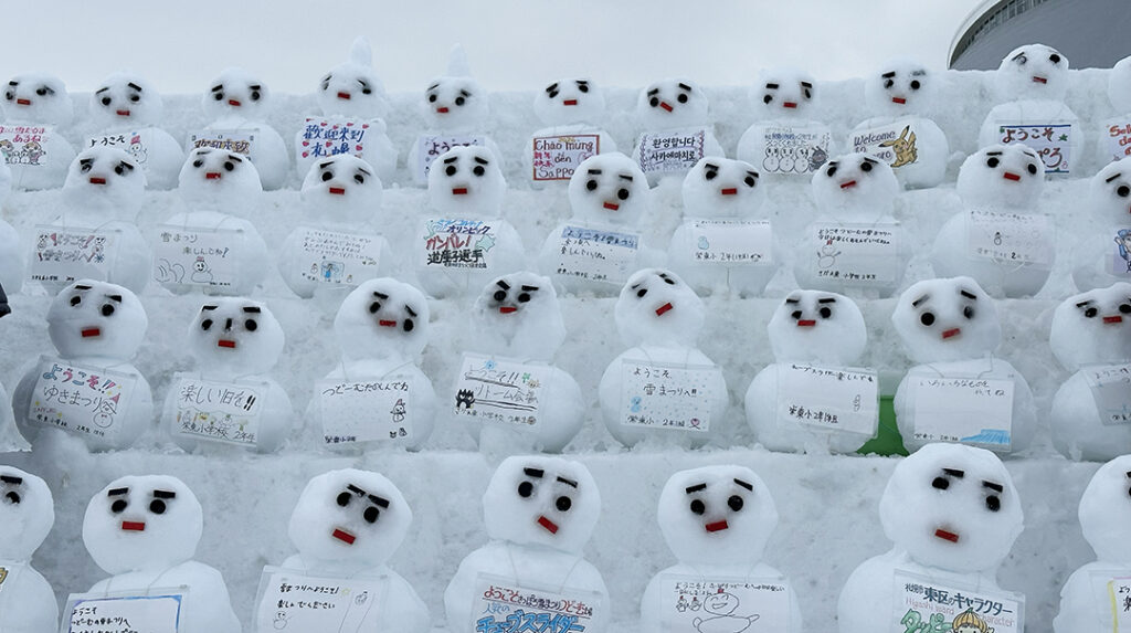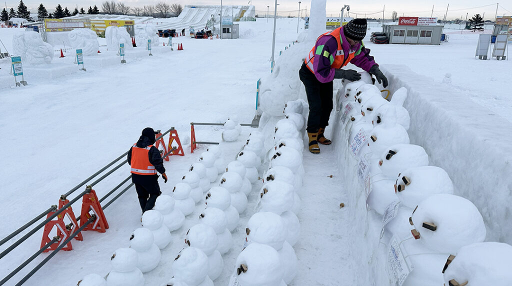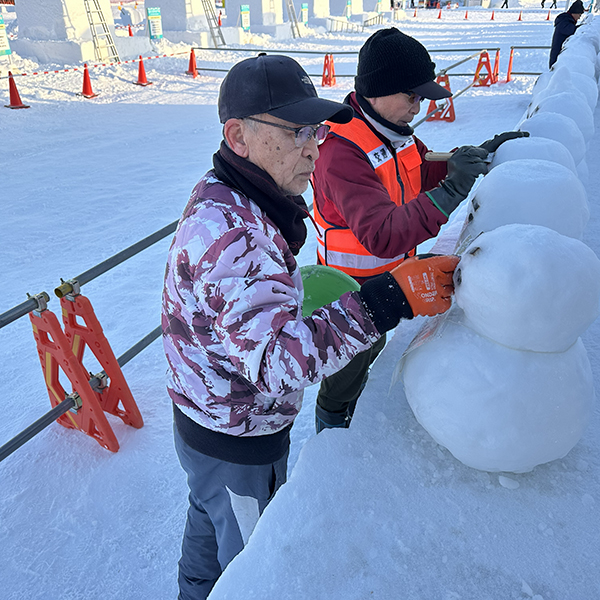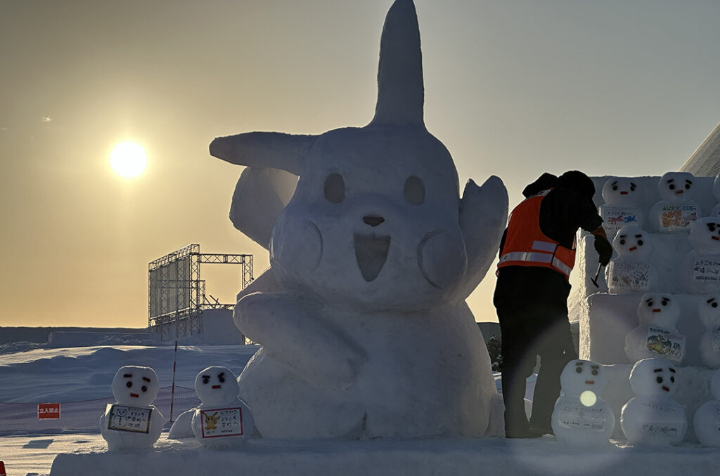 暖気で落ちた雪だるまの目や口などを補修し、アンパンマンやピカチュウもこけた頬を修復します。こうした活動があって雪像のクオリティを保つことができるのです。