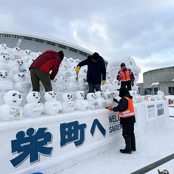 雪まつりウエルカム事業は、雪像を制作したことで終わりではありません。2月4日の開会式は気温があがり、ずいぶん雪像がいたみました。毎朝7:30から、メンバーが雪像前に集合し、メンテナンスを実施します。