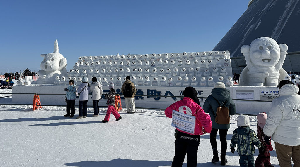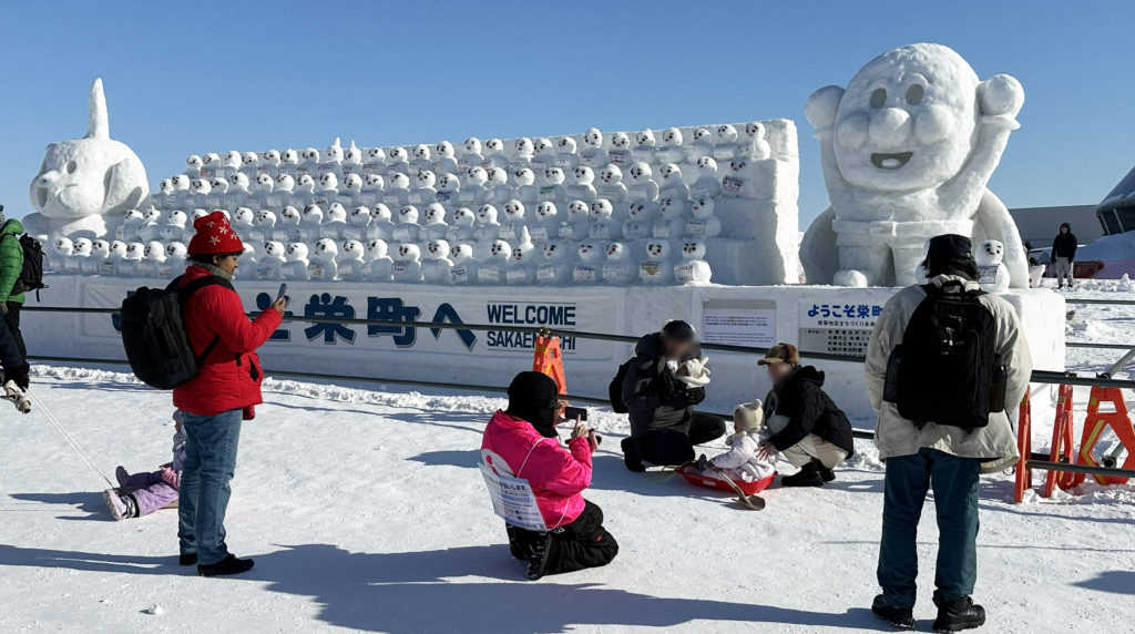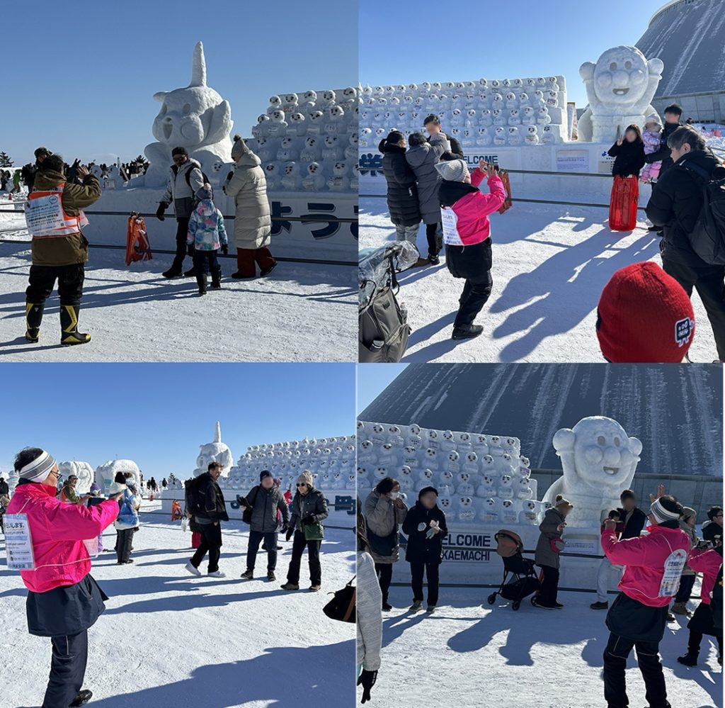 栄東地区が心を込めて制作し、毎朝、メンテナンスをしている雪像前は、絶好の写真スポットです。インスタやXなどのSNSにのせて国内外に発信され、「ようこそ栄町へ」という言葉にふさわしい、おもてなしの素晴らしさを広く伝えてくれることでしょう。