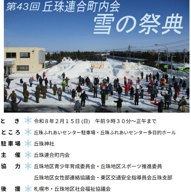 令和8年2月15日(日曜日)午前9時30分より、丘珠ふれあいセンターで丘珠連合町内会が主催する第43回雪の祭典を開催します。