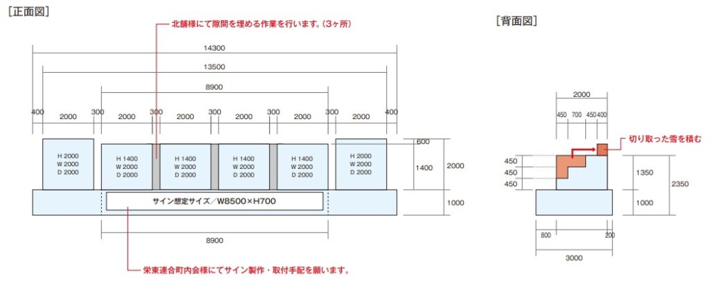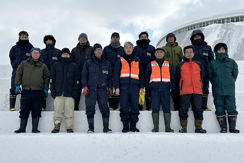 1月30日、横約14m、高さ3m、奥行き3mの雪塊から、4段のひな壇を制作しました。設計図をもとに、エンジンチェンソーで雪のブロックを切り出し、各段を水平に削り、雪のシャーベットでブロックをつなぎ、表面を化粧する作業です。15人の東区緑化協力会(会長 倉本諭・株式会社岩崎造園 代表取締役)のメンバーが息の合った作業で3時間余りで見事なひな壇の完成です。