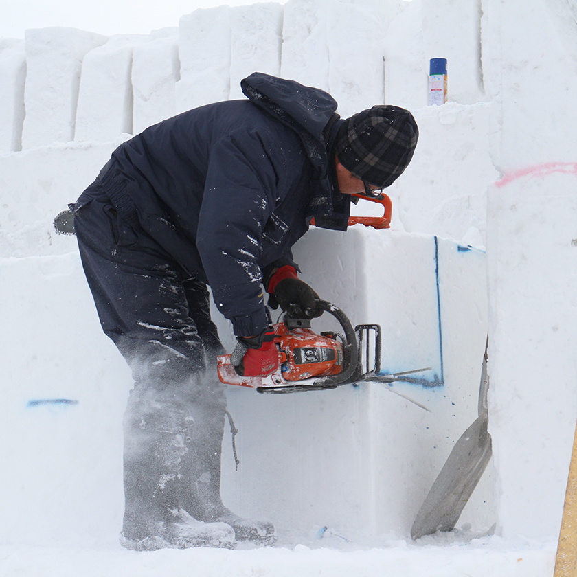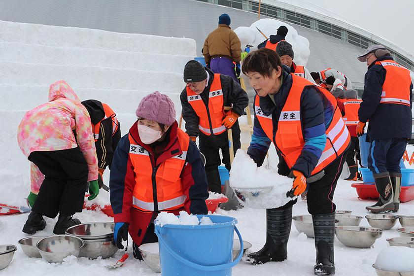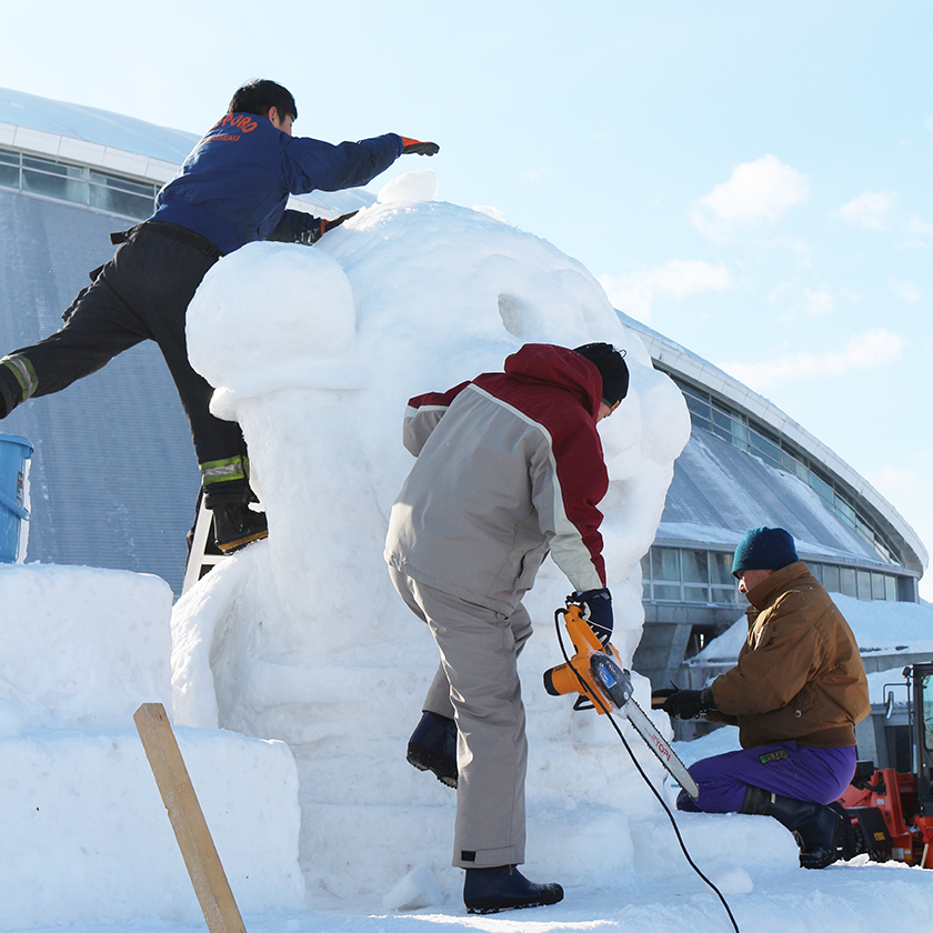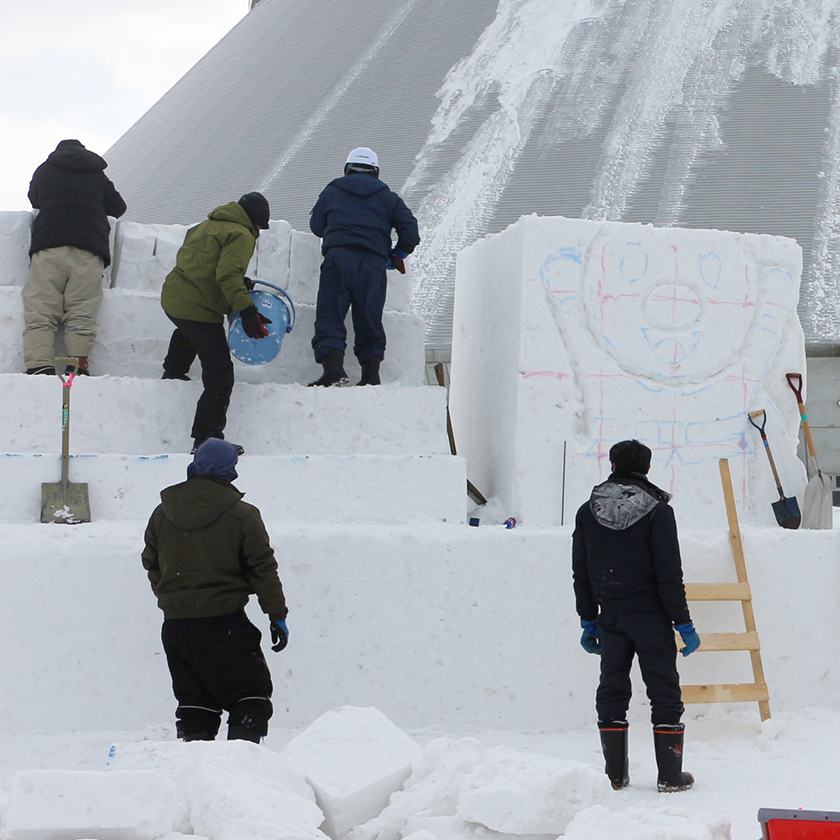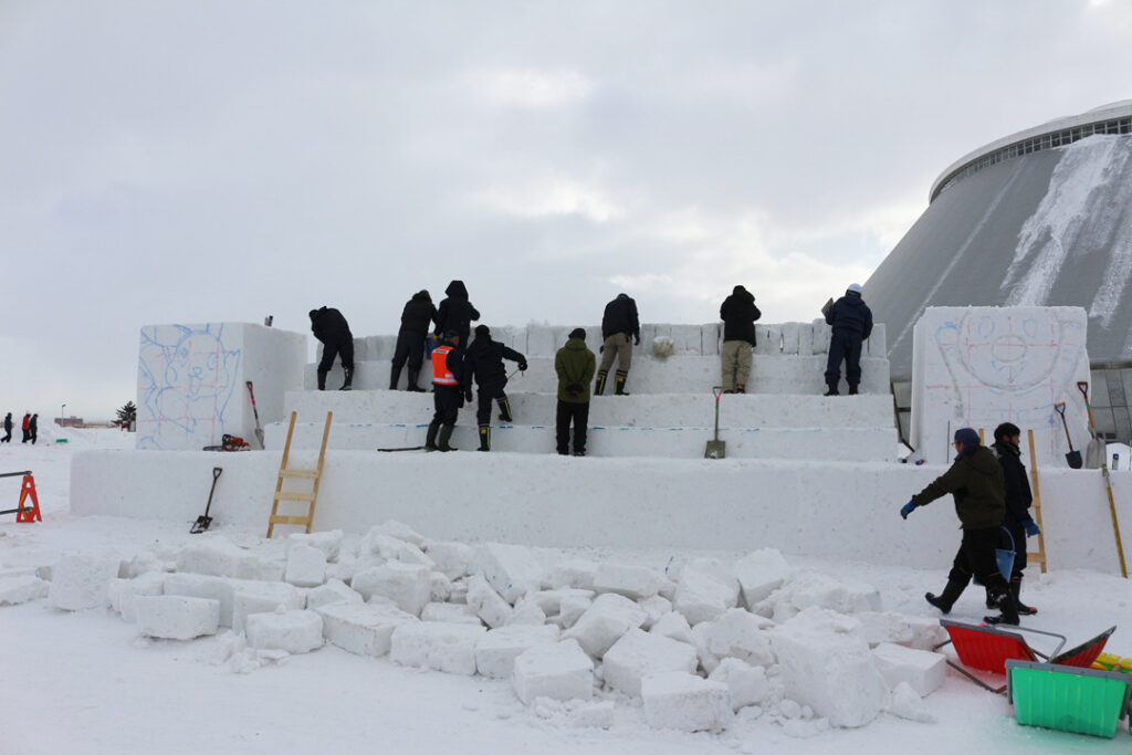 雪まつり実行委員会が準備した雪塊から正確に削り出しを実施