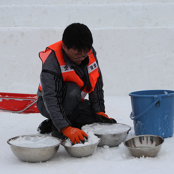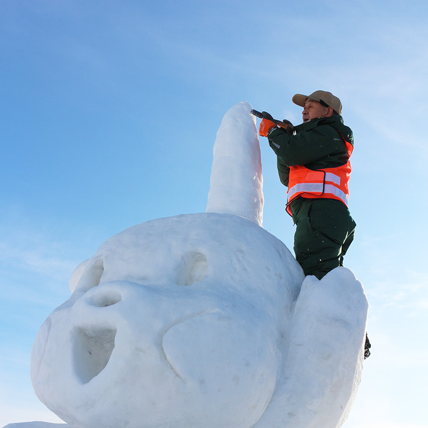 雪像は作って終わりではありません。2月4日から2月11日までは、早朝午前7時すぎには、10人余りが雪像前に集合です。2月4日朝には暖気ですでに雪だるまの目、口が落下し、バケツに新雪と水を入れてシャーベットをつくり補修します。2月8には、20㎝を超える大雪ですっぽり雪で覆われた雪像から雪を払います。早朝-17℃を記録しても早朝作業が続きました。こうした目に見えない作業が8日間の雪像のクオリティを保ちます。