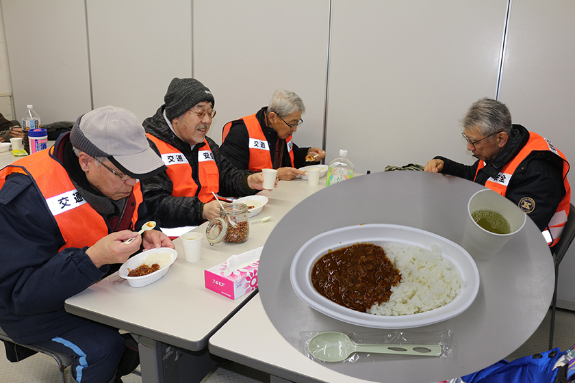 昼食は、つどーむの会議室の関係でカレーの炊き出しができず、都心部でカレー屋さんを営む栄東地区のご夫婦が作った無水カレーで屋外作業での寒さや疲れをいやしました。