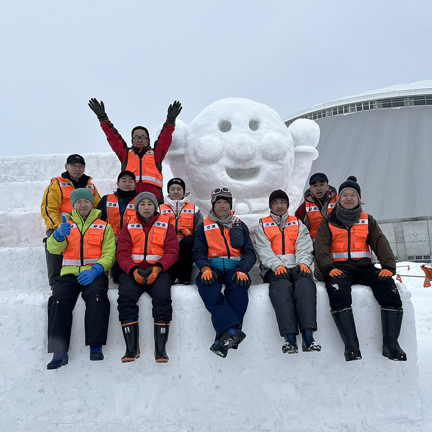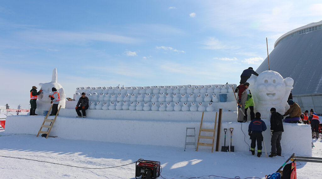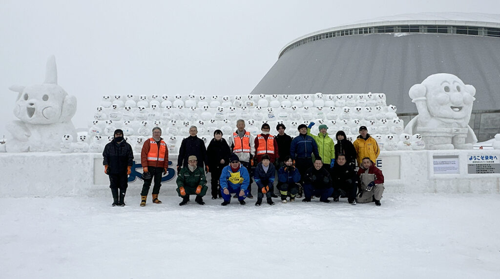 2月2日には、アンパンマン、ピカチュウの制作が本格化しました。実行委員、町内会役員、東消防署有志、若者支援センターなど36名が参加し、アンパンマンは、東消防署有志が、ピカチュウは、実行委員の山田豊委員、髙橋節雄委員のもと、若者支援センターのボランティアが担当しました。ひな壇に並ぶ雪だるまは、100基余りのため、不足する40基あまりの雪だるまを連町女性部や役員などの方々で新雪に水を混ぜてシャーベットをつくり、大小2組のボールで雪を固めて制作しました。