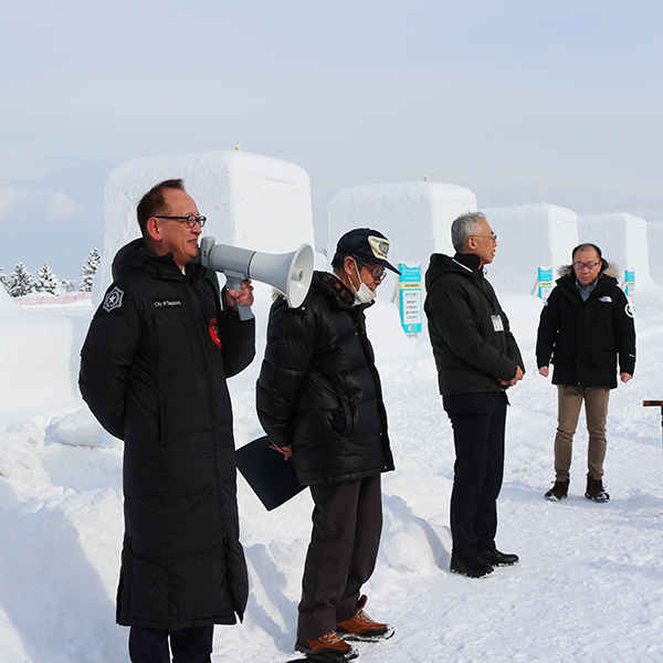 2月4日は13時からつどーむ会場の開会式が実施されました。五十嵐・実行委員をはじめ実行委員、ボランティアも11名が参加しました。栄東地区まちづくり未来会議の菊地裕嗣・代表から札幌市の秋元克広・市長にウエルカム雪像の引き渡しが行われました。開会式後には、参加者と市長の記念撮影で、市長からは、制作に携わった方々への謝辞とねぎらいの言葉がありました。