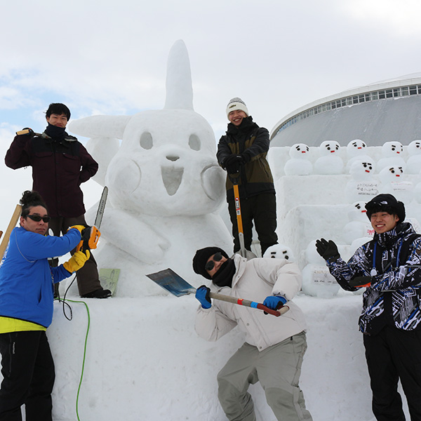 ピカチュウも同様です。耳に厚みを持たせ、ほほに丸みをつけて、小さな「こて」で精密に表面を削ります。雪像づくり15回の熟練の技が光ります。両雪像とも4日間、延べ12時間余りの作業で、つどーむ会場入口に鎮座するウエルカム雪像の完成です。