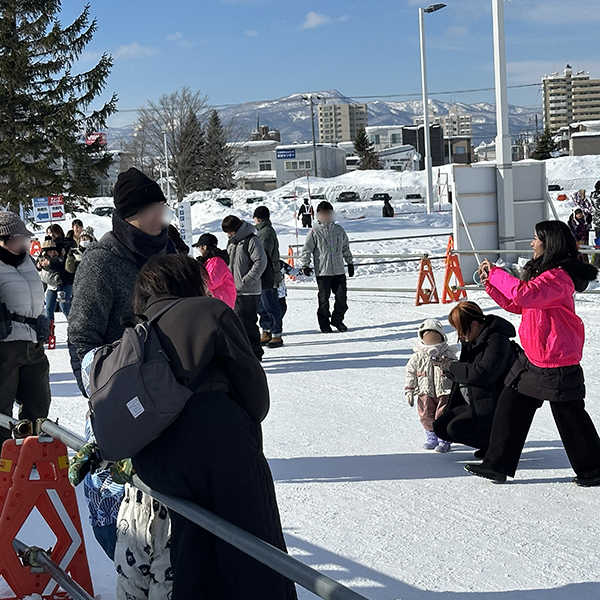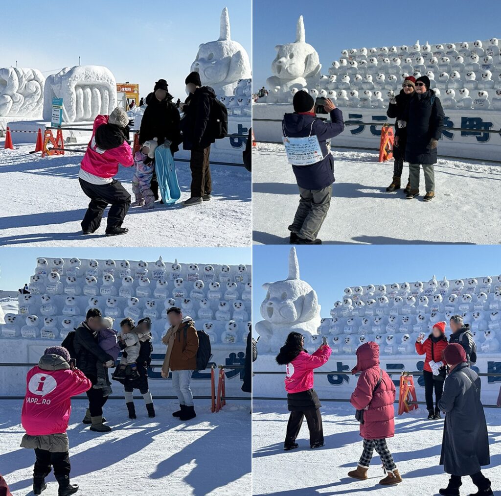雪像前でシャッター押しで記念撮影をお手伝い