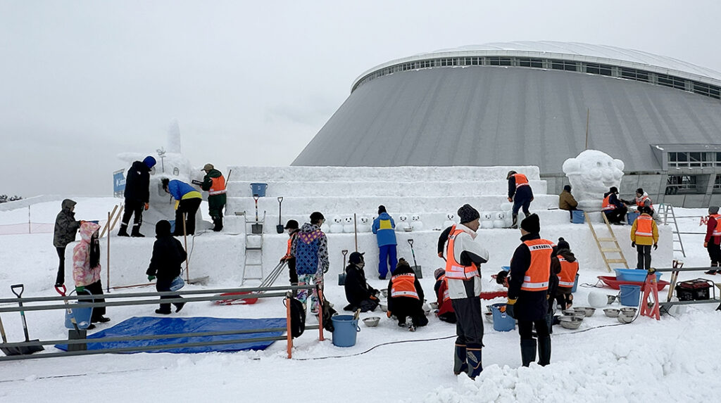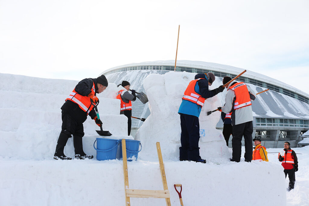 中雪像を丁寧に仕上げ、ウエルカム雪像の完成へ