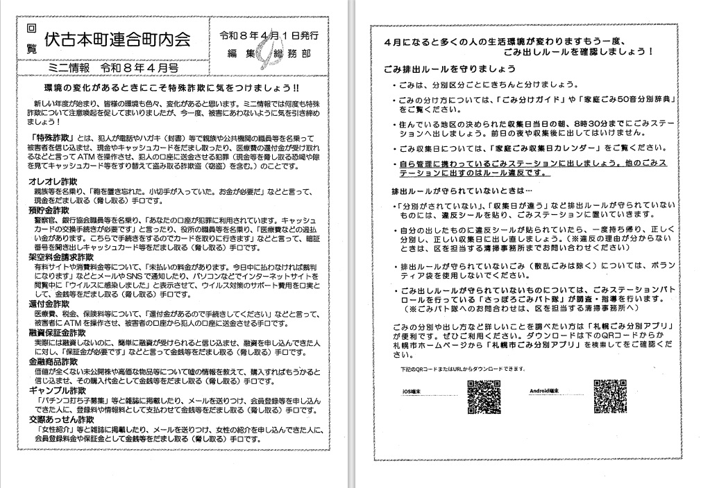 伏古本町連合町内会「ミニ情報(令和8年4月号)」発行