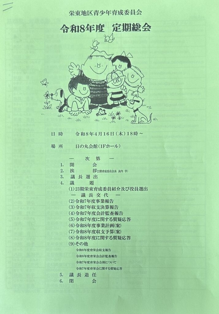 この日は、初顔合わせの方々もおり、委員会の活動内容などを熱心に聞いていました。総会は、7年度事業・決算、8年度事業計画・収支予算を審議、決定し、いよいよ新生・栄東地区青少年育成委員会の活動が始まります。